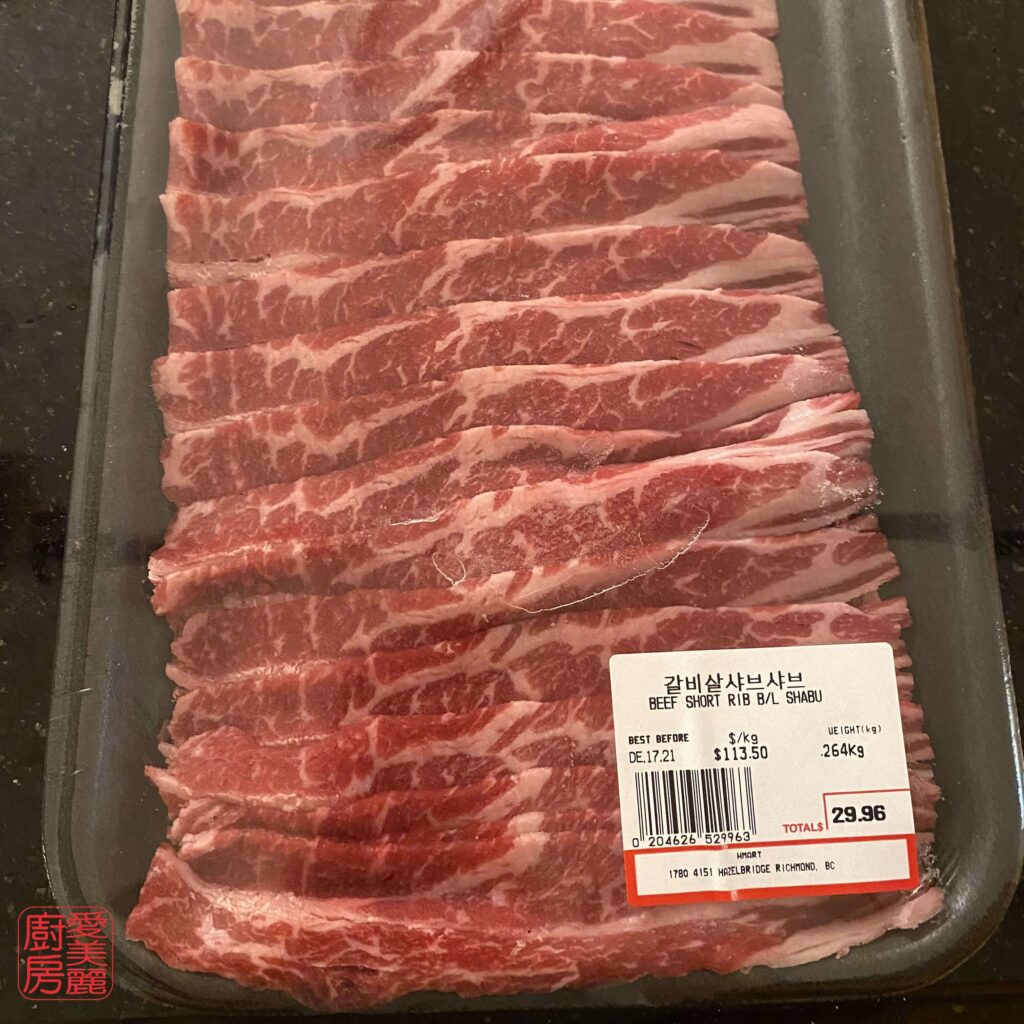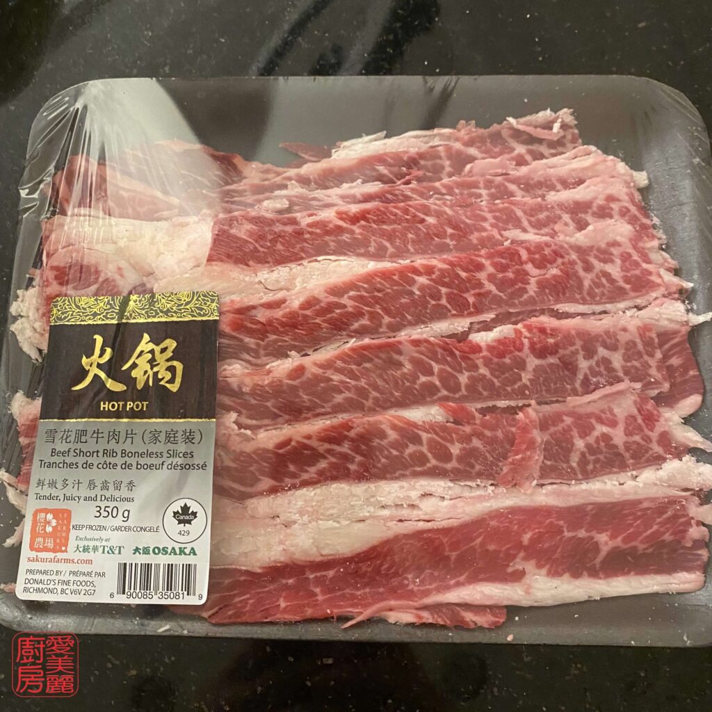 - Beef 牛肉片(niú ròu piàn) is probably the most popular ingredient and I can’t imagine hot pot without it. High quality fatty and well marbled thin slices of beef 雪花肥牛(xǔe huā féi niú) can set you back significantly. But, we can’t splurge all the time, at least I can’t! You can get pretty good marbled beef from regular short rib. Ribeye is also a good choice that won’t break the bank.