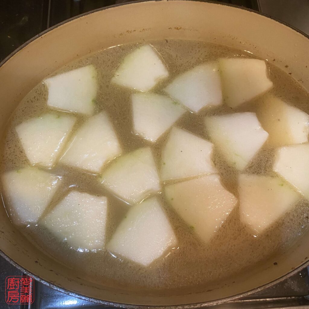 - White radish 白蘿蔔 (bái luó bo): very popular. Add this first to flavour the soup