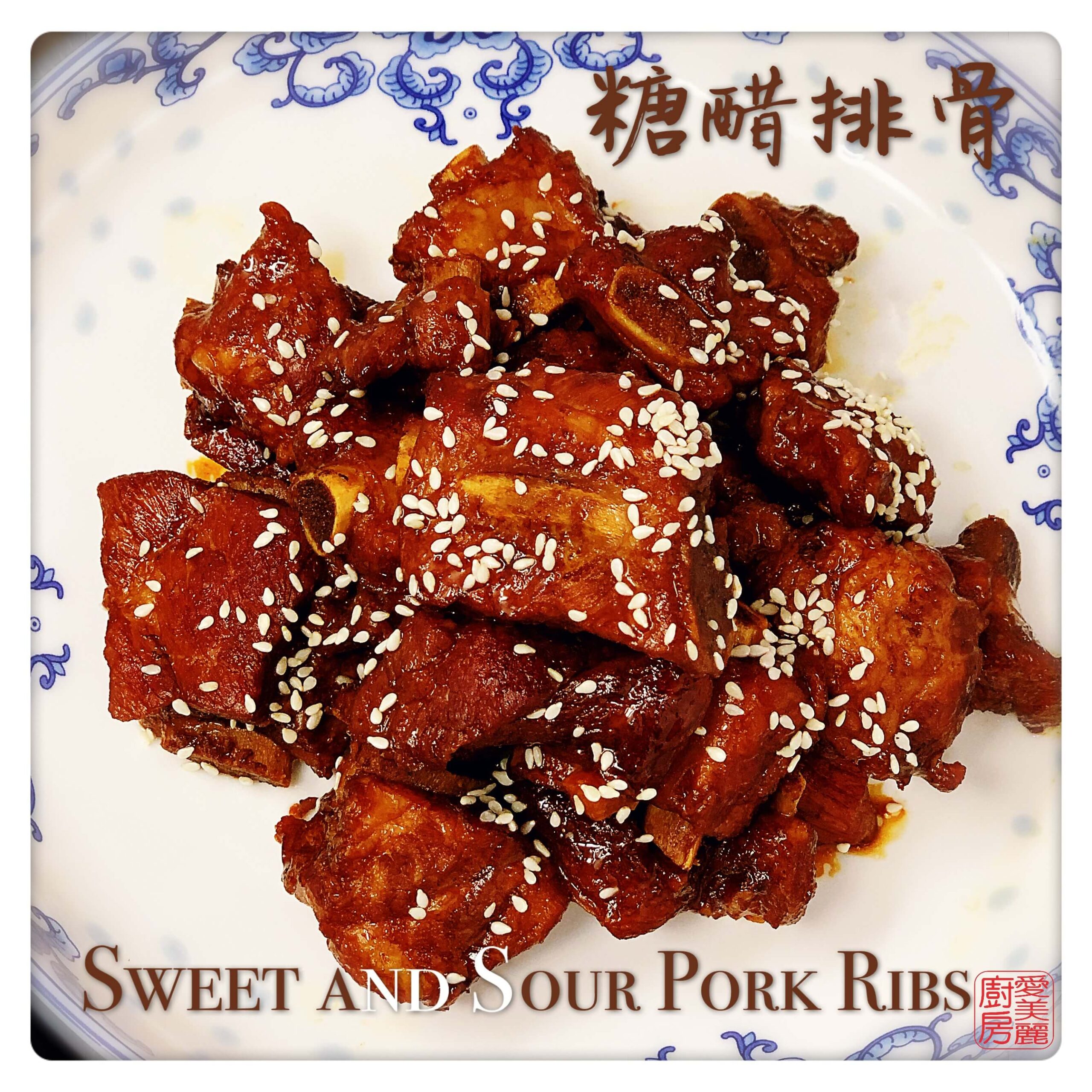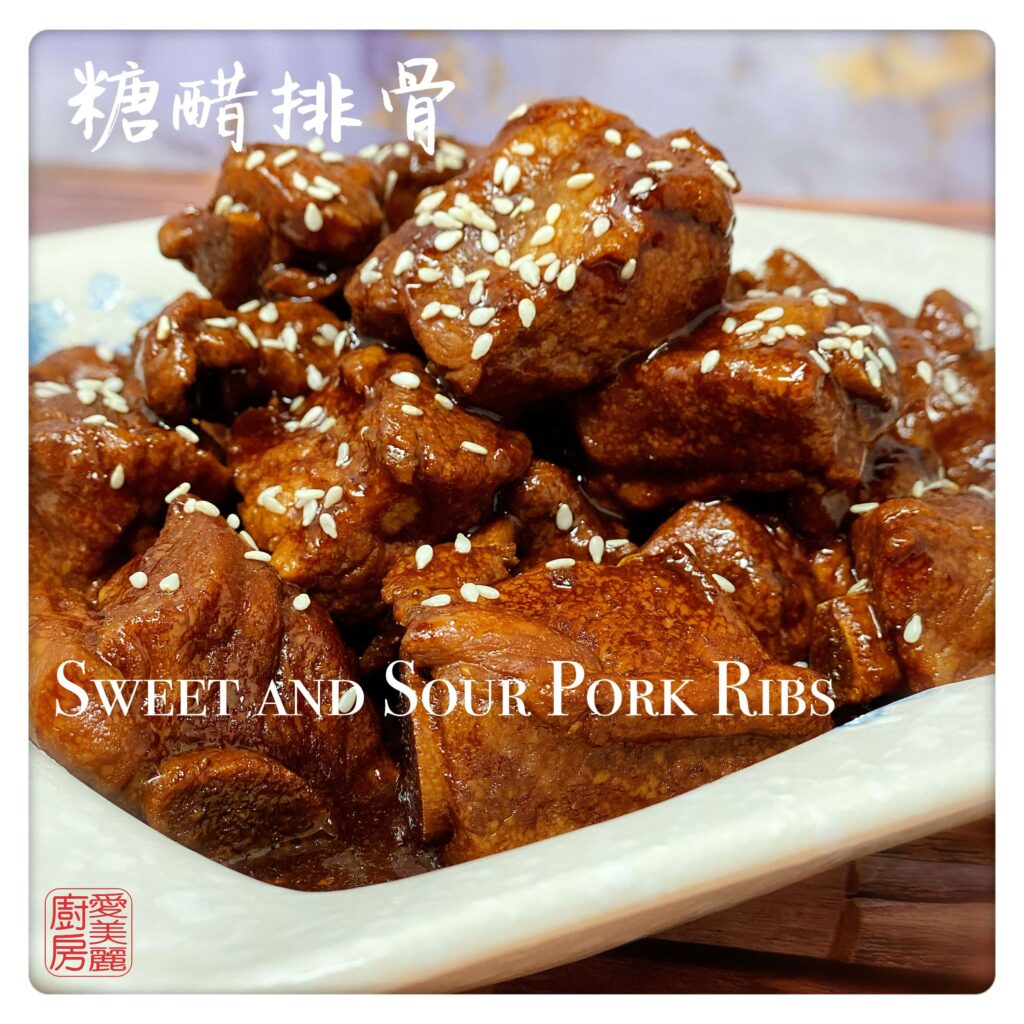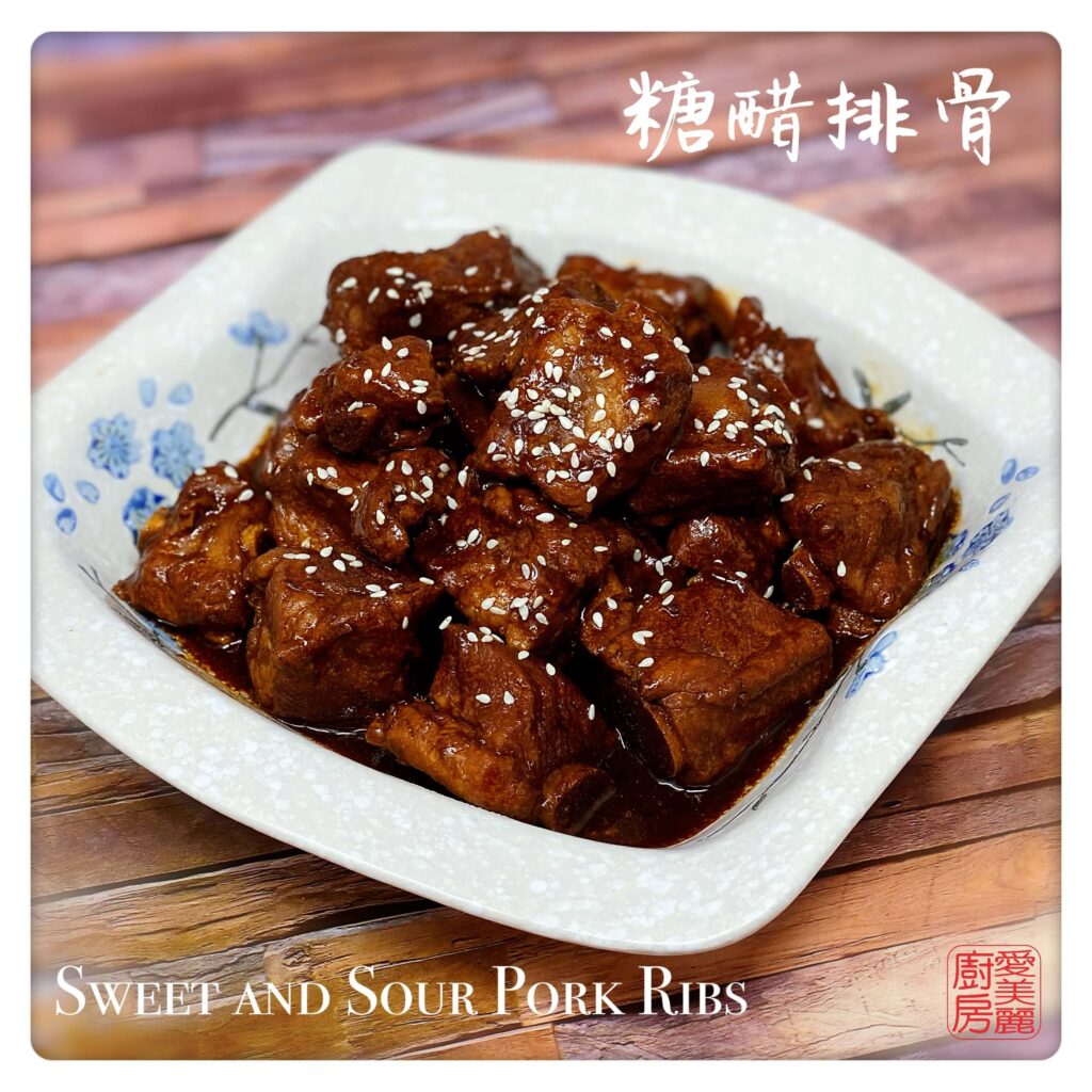 Sweet and Sour Pork Ribs 糖醋排骨 (táng cù pái gǔ) is a very traditional Jiangsu dish from Wuxi in Jiangsu province. This dish may have originated in the late Tang Dynasty or early Sung Dynasty. The sweetness comes from Chinese rock sugar (冰糖 cane) and the sourness comes from mature black vinegar (陳醋). Adding soy sauce gives it a perfectly balanced flavour. The meat on the braised ribs are softened by the acidity of the vinegar which fall off the bone when you bite into it. It goes great with rice or on its own as an appetizer. During ancient times, it was cold dish to go with alcohol. The well-known Cantonese sweet and sour pork evolved from the Sweet and Sour Pork Ribs 糖醋排骨.